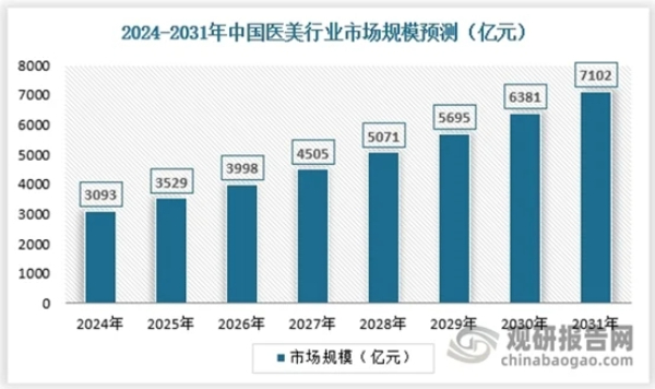 根据观知海内信咨询《2025-2032年中国医美行业发展趋势分析与投资战略规划研究报告》,颜值经济、悦己经济以及医美技术愈发成熟等因素影响,医美市场规模得到较快增长。截至2023年,我国医美行业市场规模约为2669亿元。而2024年预测市场规模为3093亿元,预计2031年医美行业市场规模达7102亿元,显示出巨大的增长潜力。