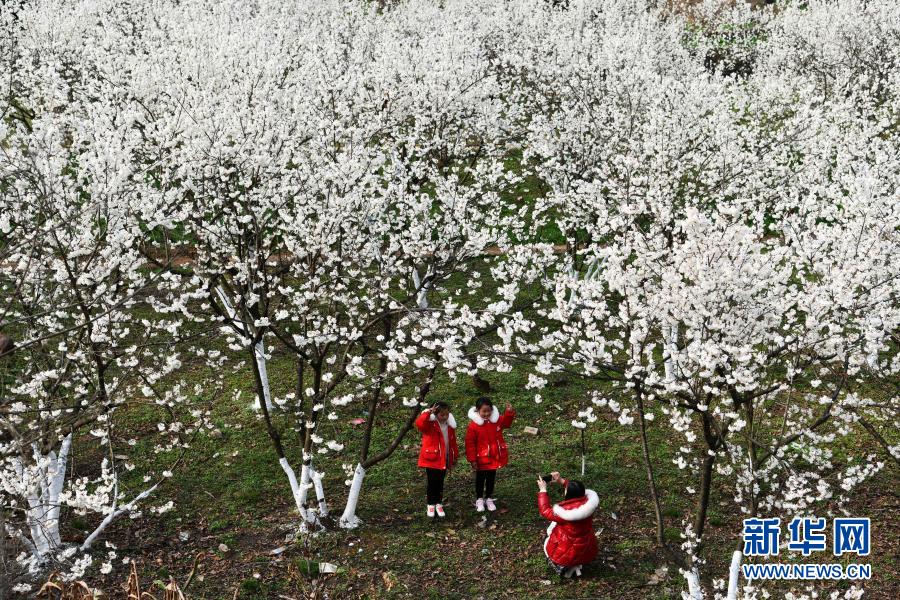 游客在貴州省黔西縣新仁苗族鄉(xiāng)化屋村的櫻桃樹下留影(2月19日攝)。新華社記者 楊文斌 攝