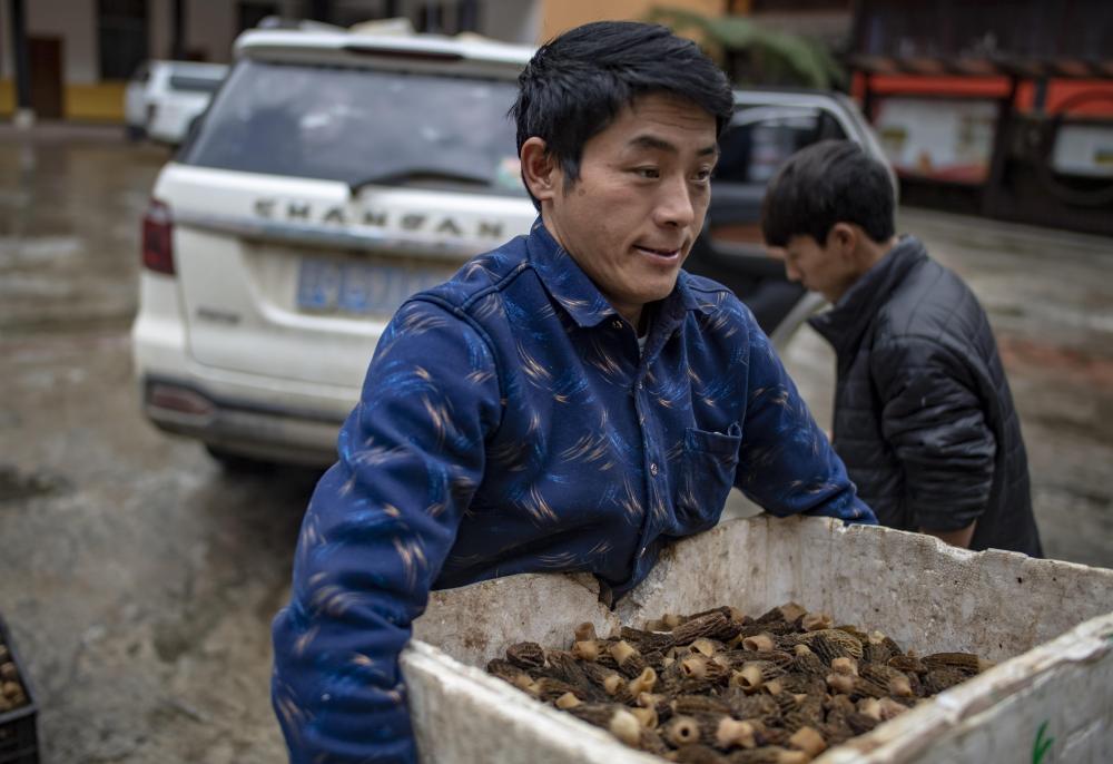 云南貢山縣獨龍江鄉(xiāng)龍元村“致富能手”和曉永在鄉(xiāng)里賣羊肚菌(2019年4月19日攝)。 新華社記者 江文耀 攝