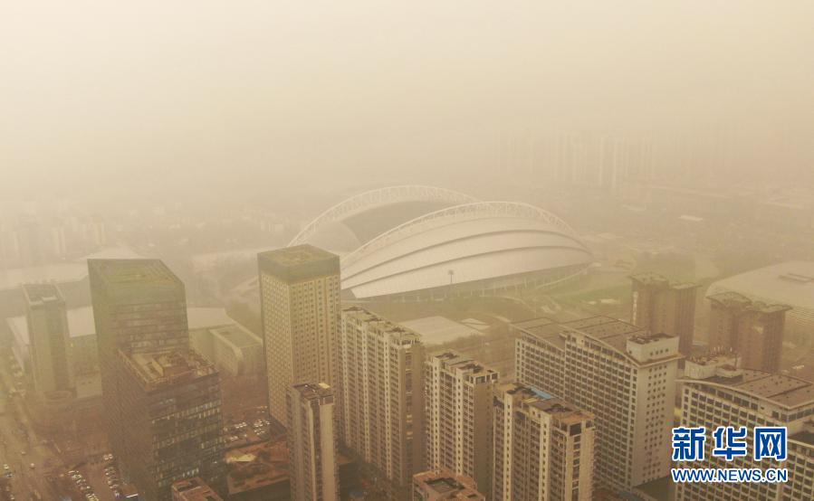 這是3月15日拍攝的遼寧省沈陽市奧體中心體育場(無人機照片)。當日,我國北方多地出現(xiàn)沙塵天氣。新華社記者 楊青 攝