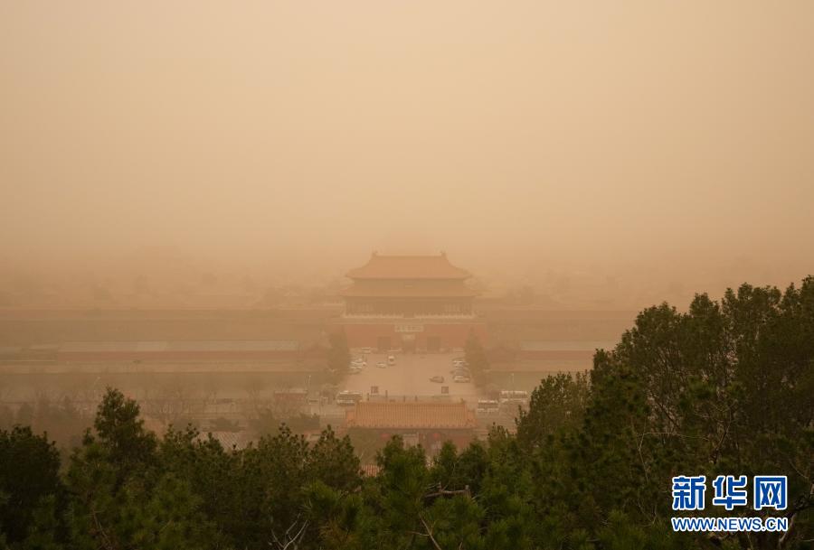 這是3月15日在景山上拍攝的北京故宮。當(dāng)日,我國(guó)北方多地出現(xiàn)沙塵天氣。新華社記者 陳曄華 攝