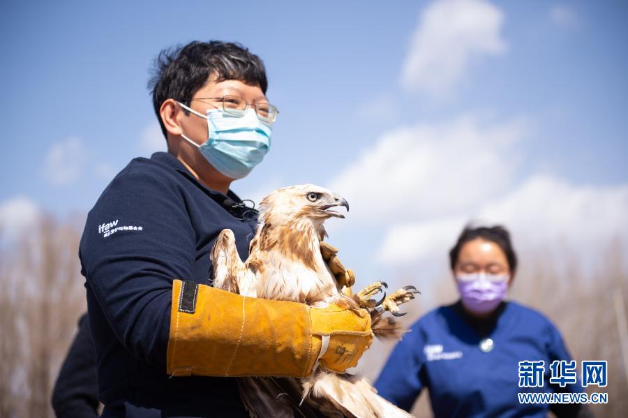 3月20日,北京猛禽救助中心猛禽康復師周蕾(左)抱著即將被放飛的大鵟。新華社記者 陳鐘昊 攝