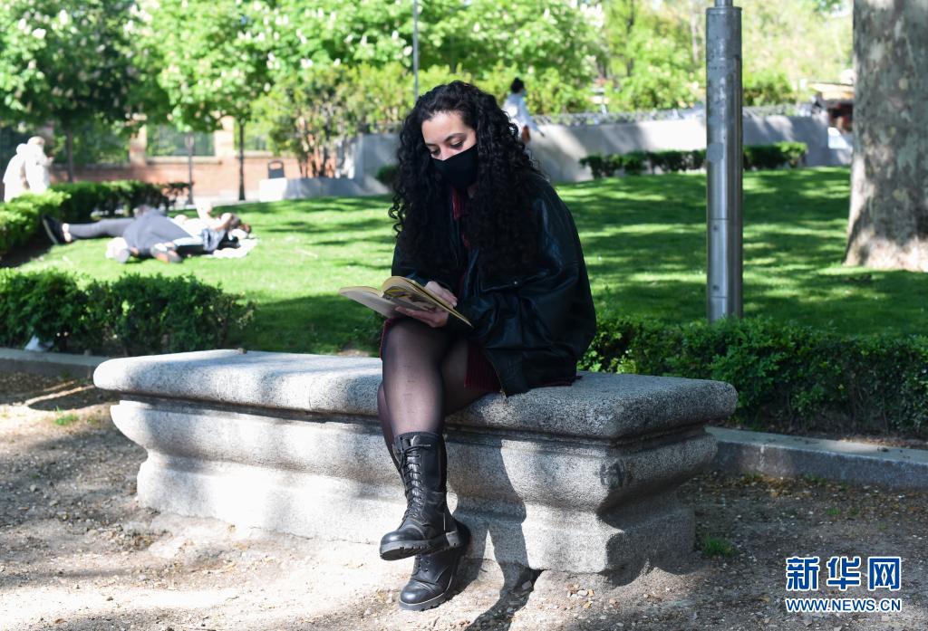 4月17日,一名女子在西班牙馬德里一個(gè)公園內(nèi)讀書。