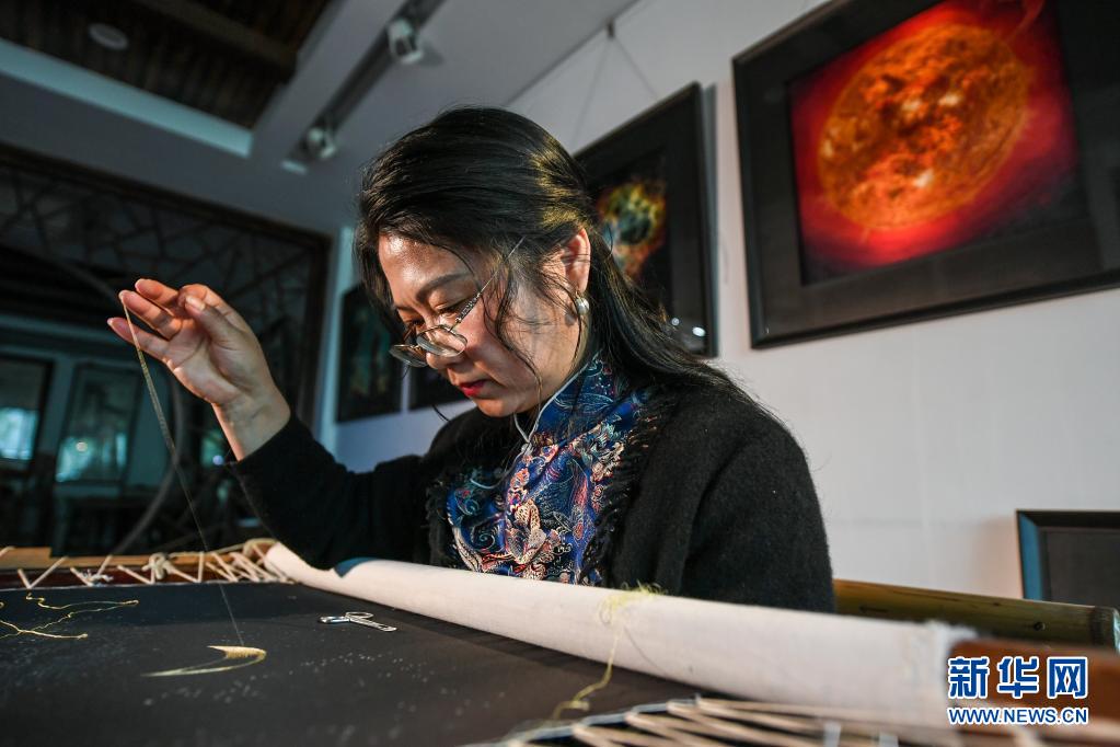 陳英華在位于蘇州高新區(qū)鎮(zhèn)湖街道的蘇繡工作室內(nèi)刺繡(4月14日攝)。