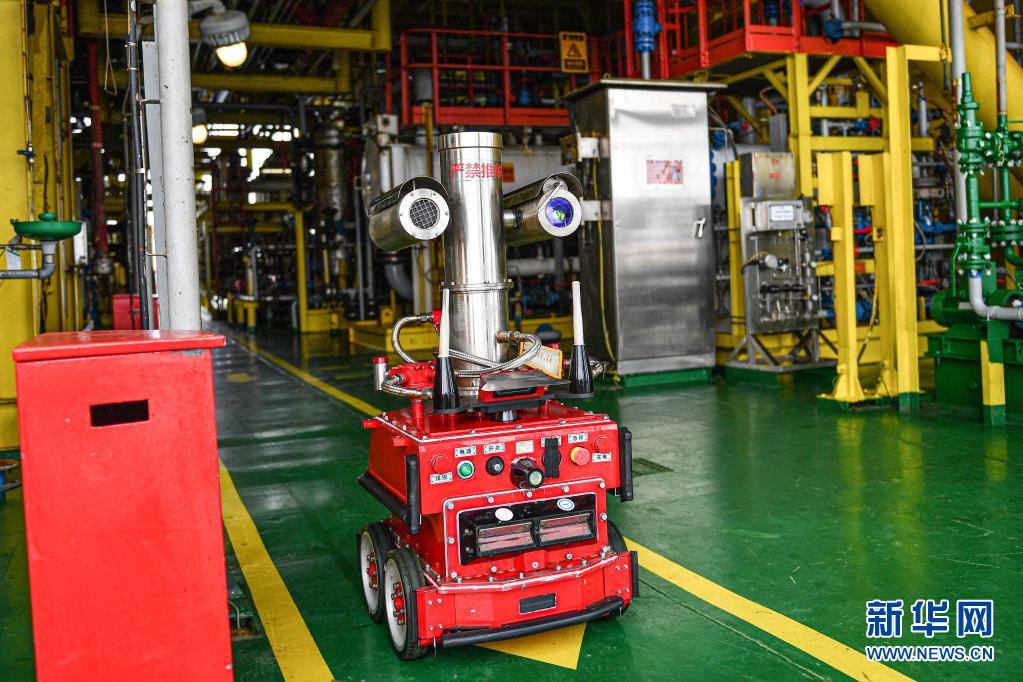 4月25日,巡檢機器人在中國海油樂東15-1氣田上進行巡檢作業(yè)。