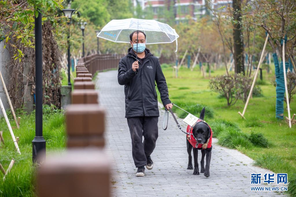 吳虎剛今年45歲,和同是盲人的妻子經營著一家盲人推拿診所。每天上班,導盲犬“C羅”都會陪伴吳虎剛從家走到診所(4月11日攝)?! ⌒氯A社發(fā) (張夢 攝)