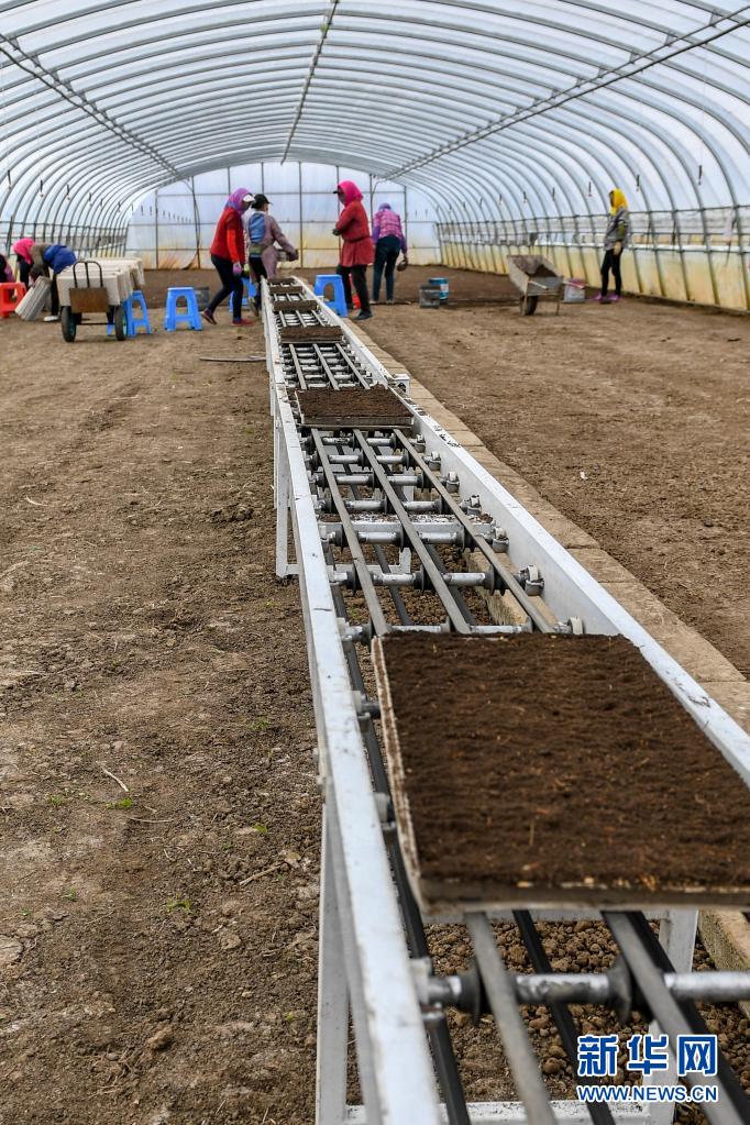 在吉林省吉林市永吉縣九月豐家庭農(nóng)場(chǎng),水稻育秧生產(chǎn)線將種好種子的秧盤(pán)送到農(nóng)民手中(4月13日攝)。新華社記者 張楠 攝