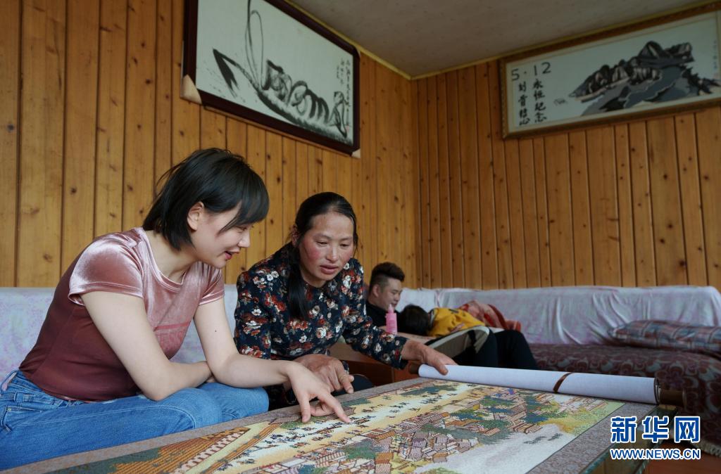 5月6日,李蕓香(左二)給女兒林苓介紹她花4年時間繡的《清明上河圖》十字繡作品。 新華社記者 江宏景 攝