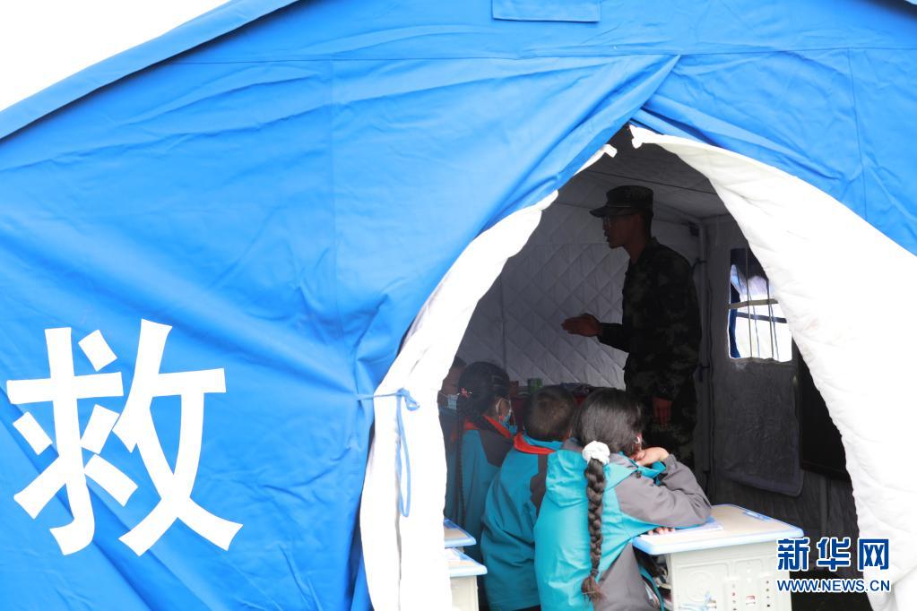 5月24日,武警青??傟?duì)果洛支隊(duì)機(jī)動(dòng)大隊(duì)排長張國睿為花石峽鎮(zhèn)藏文中心寄宿制小學(xué)的孩子上課。新華社記者 劉芳 攝