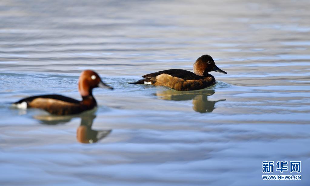 6月14日在拉魯濕地拍攝的兩只小??。夏日里,鳳頭??和小??在西藏拉薩拉魯濕地國(guó)家級(jí)自然保護(hù)區(qū)水面上嬉戲。新華社記者 張汝鋒 攝