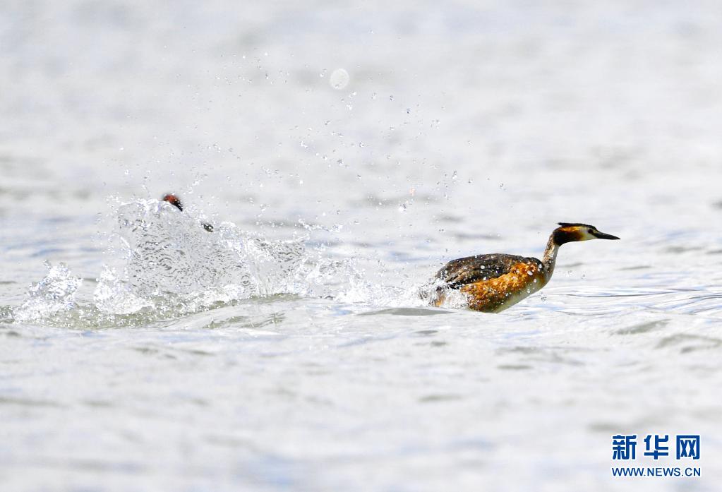 6月14日在拉魯濕地拍攝的鳳頭??。夏日里,鳳頭??和小??在西藏拉薩拉魯濕地國(guó)家級(jí)自然保護(hù)區(qū)水面上嬉戲。新華社記者 張汝鋒 攝