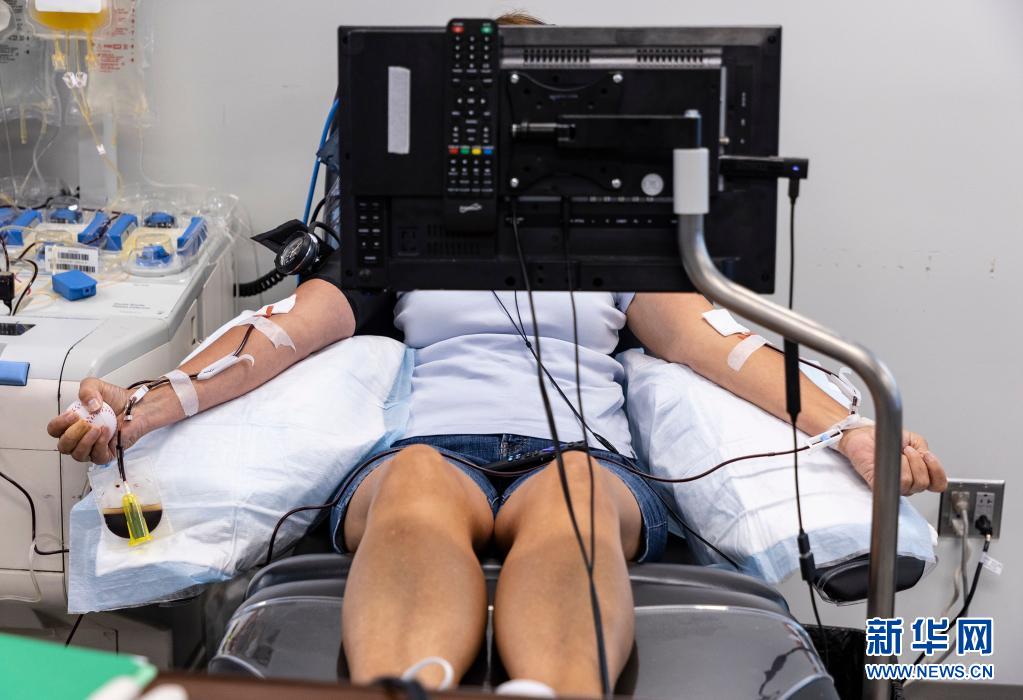 6月14日,在美國芝加哥,一名獻(xiàn)血志愿者在大芝加哥地區(qū)紅十字會(huì)一獻(xiàn)血站內(nèi)獻(xiàn)血。新華社發(fā)(喬爾·萊納攝)