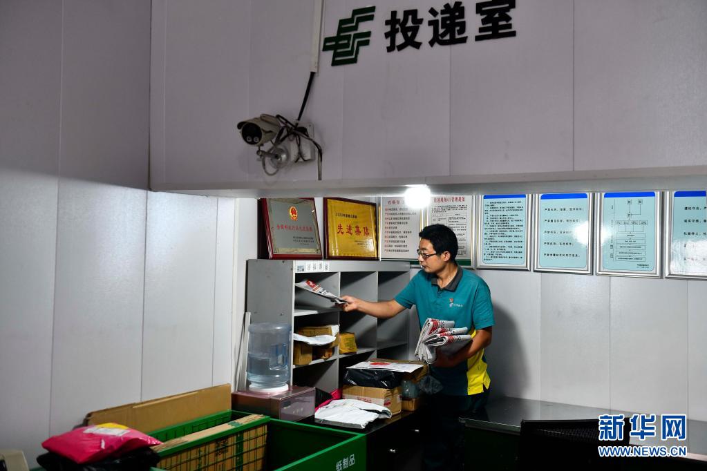 6月20日,在微山縣南陽(yáng)鎮(zhèn),郵遞員王少朋在分揀郵件。