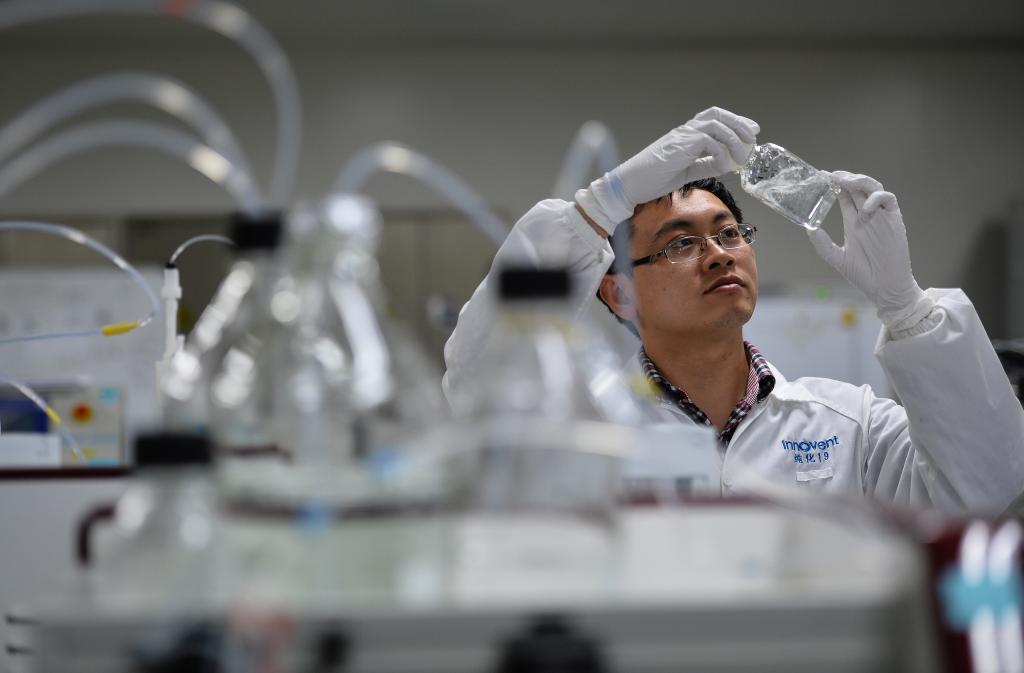 2017年5月9日,江蘇蘇州,在信達生物制藥(蘇州)有限公司研發(fā)實驗室,一名工程師在觀察藥物中間產品外觀。 新華社記者 李響 攝