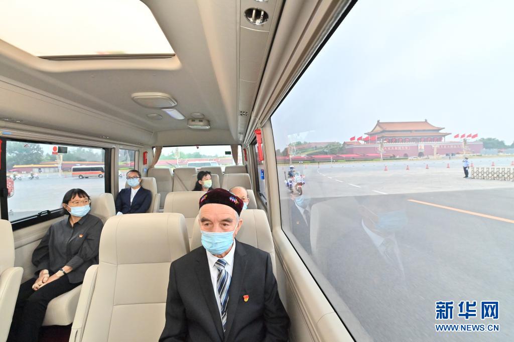 這是買買提江·吾買爾(前)、張桂梅(左一)、吳天一(右一)乘車前往人民大會(huì)堂。