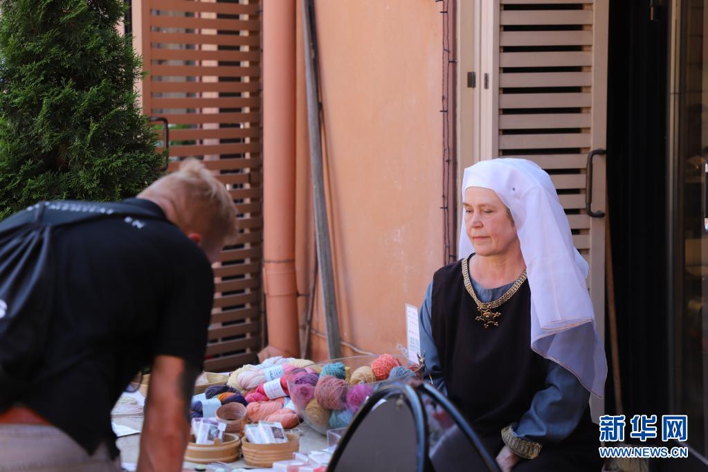7月1日,一名身著中世紀(jì)風(fēng)格服裝的攤主在芬蘭圖爾庫(kù)舉行的“中世紀(jì)市集”上向顧客售賣(mài)紀(jì)念品。