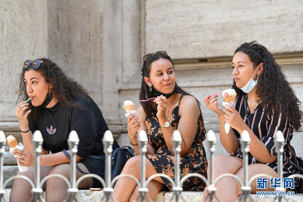 7月11日,人們?cè)谝獯罄_馬吃冰淇淋消暑。