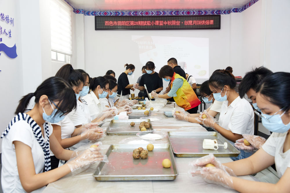 在广西百色市田阳区老乡家园"阳光快聘"零工市场,工作人员在赋能小课堂组织糕点制作培训。