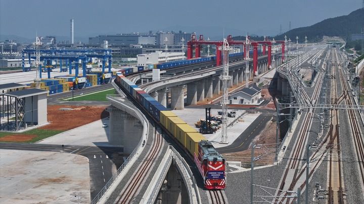 2025年6月,一列满载小商品的“义乌-宁波舟山港”海铁联运班列从义乌(苏溪)国际枢纽港鸣笛启程。吴峰宇摄