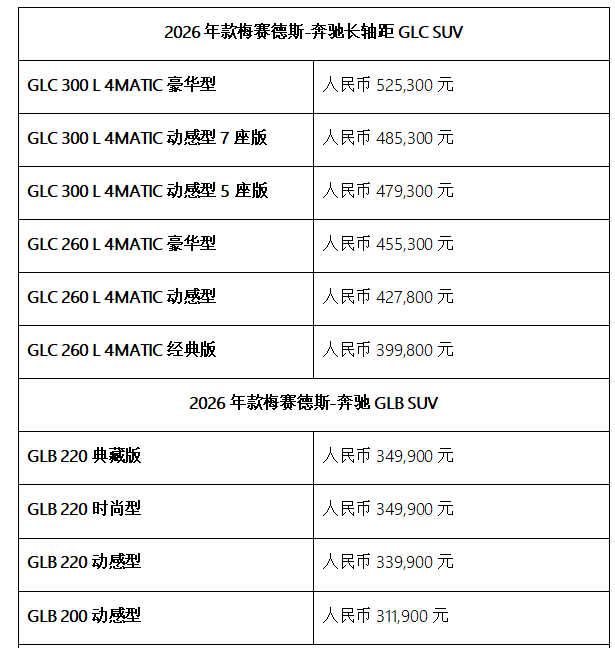 长轴距GLC SUV新增GLC 260 L 4MATIC经典版,进一步丰富客户选择。GLC 260 L 4MATIC动感型及以上车型标配导航辅助驾驶(覆盖全国范围高速路段与城市快速路段)、可加热前排座椅,无论冬季早高峰还是高速长距离行驶,都能舒适从容。GLC 260 L 4MATIC豪华型及以上车型标配智能手机数字钥匙,GLC 300 L车型标配Burmester® 3D环绕立体声音响系统,每一次启程都更具豪华仪式感。