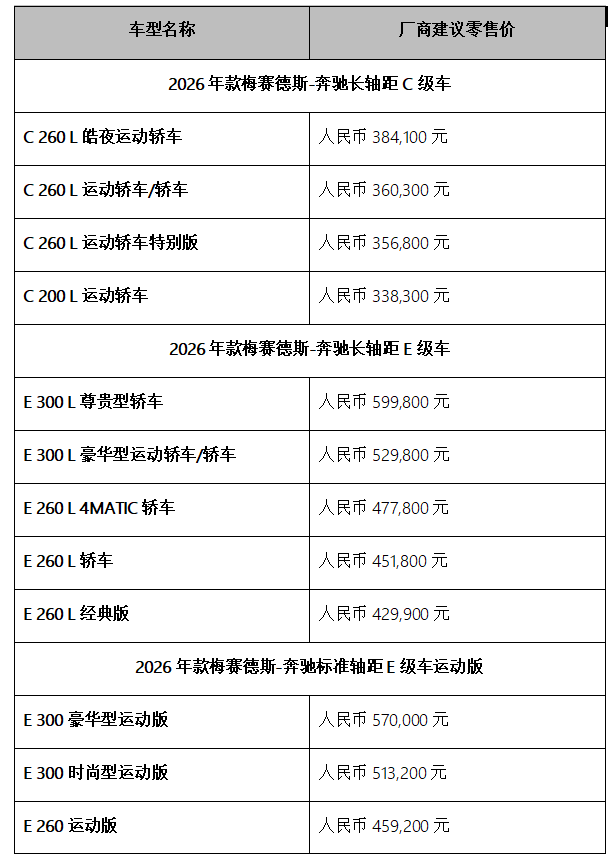 本次焕新,E级车家族产品实力全面进阶。长轴距E级车序列新增E 260 L经典版,延续原E 260 L车型经典配置的基础上,以差异化产品配置满足客户需求。全系迎来智能及舒适升级,E 260 L轿车及以上车型新增标配导航辅助驾驶(覆盖全国范围高速路段与城市快速路段)、可加热前排座椅和自动防眩目后视镜,让日常通勤更轻松、夜间驾车更从容。E 300 L豪华型及以上车型新增标配前后排座椅加热和通风,为四季出行提供舒适驾乘体验。