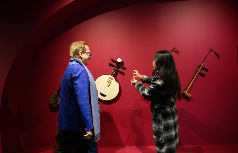 1月26日,在北京市朝阳区戏曲艺术中心,中外观众参观“百年风华·国粹新声”京剧艺术主题展上展出的乐器。