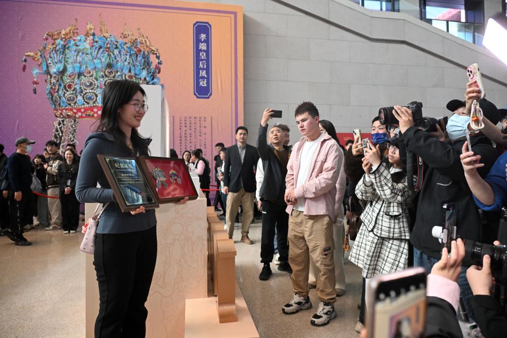 当日,国博文创团队将“纪念款凤冠冰箱贴”和纪念证书赠送给第100万件凤冠冰箱贴的购买者——来自山东东营的“95后”观众李雅菲。
