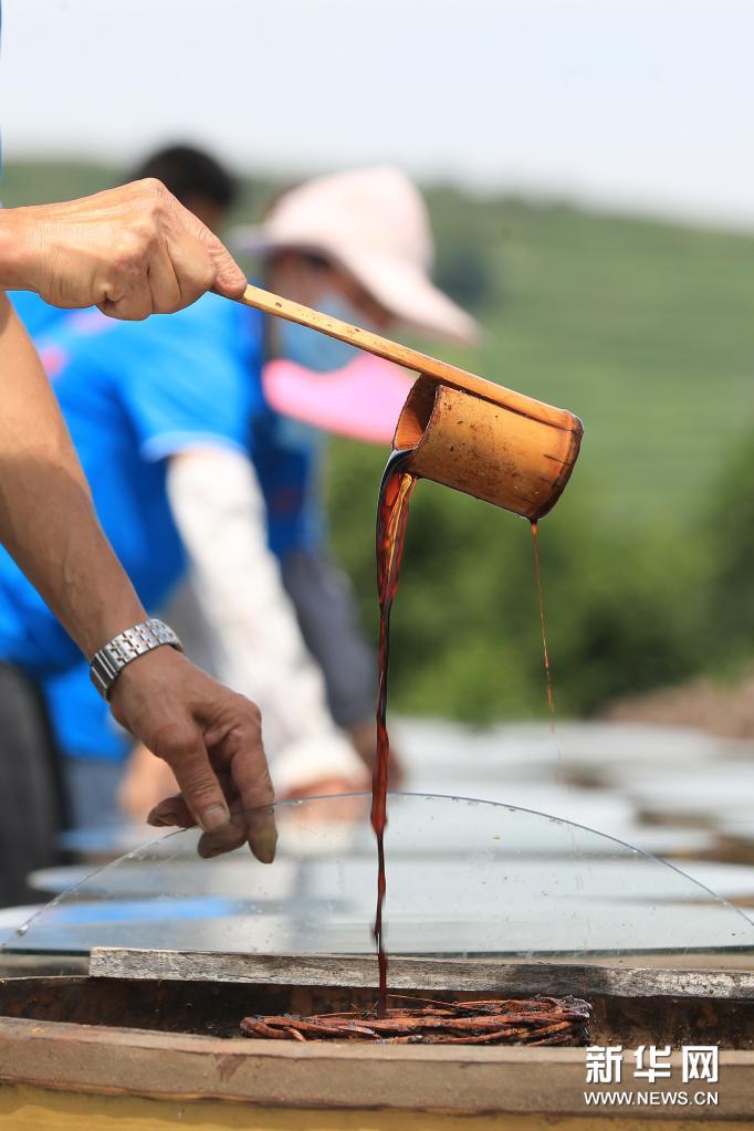 7月10日,工人在畢節(jié)市金沙縣禹謨鎮(zhèn)泡木灣醬醋基地查看醬醋發(fā)酵情況。貴州省畢節(jié)市金沙縣禹謨鎮(zhèn)是傳統(tǒng)醬醋生產(chǎn)大鎮(zhèn),年產(chǎn)陳醋2萬余噸。在長期的釀造實踐中,禹謨鎮(zhèn)利用當(dāng)?shù)鬲毺氐沫h(huán)境資源,用100多味中草藥與麥麩制曲,以當(dāng)?shù)貎?yōu)質(zhì)大米、玉米為原料,經(jīng)過70多道工序,經(jīng)一年以上露天發(fā)酵成獨特的“醬香醋”。該釀醋技藝2019年被列入貴州省級非物質(zhì)文化遺產(chǎn)名錄。今年以來,禹謨鎮(zhèn)將醬醋產(chǎn)業(yè)與旅游業(yè)結(jié)合起來一體化推進,把泡木灣醬醋基地打造成國家3A級景區(qū),有效拓寬當(dāng)?shù)厝罕娫鍪罩赂煌緩剑叱隽艘粭l工旅融合的鄉(xiāng)村振興新路。新華社發(fā)(韓賢普攝)