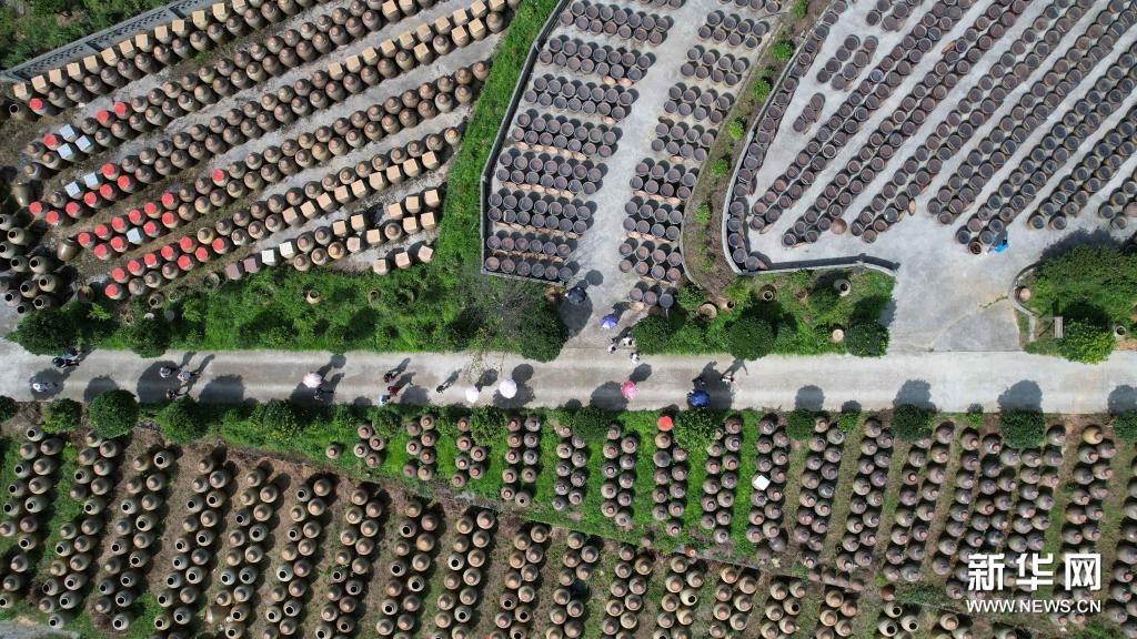 7月10日,游客在畢節(jié)市金沙縣禹謨鎮(zhèn)泡木灣醬醋基地參觀(無人機(jī)照片)。新華社發(fā)(韓賢普攝)
