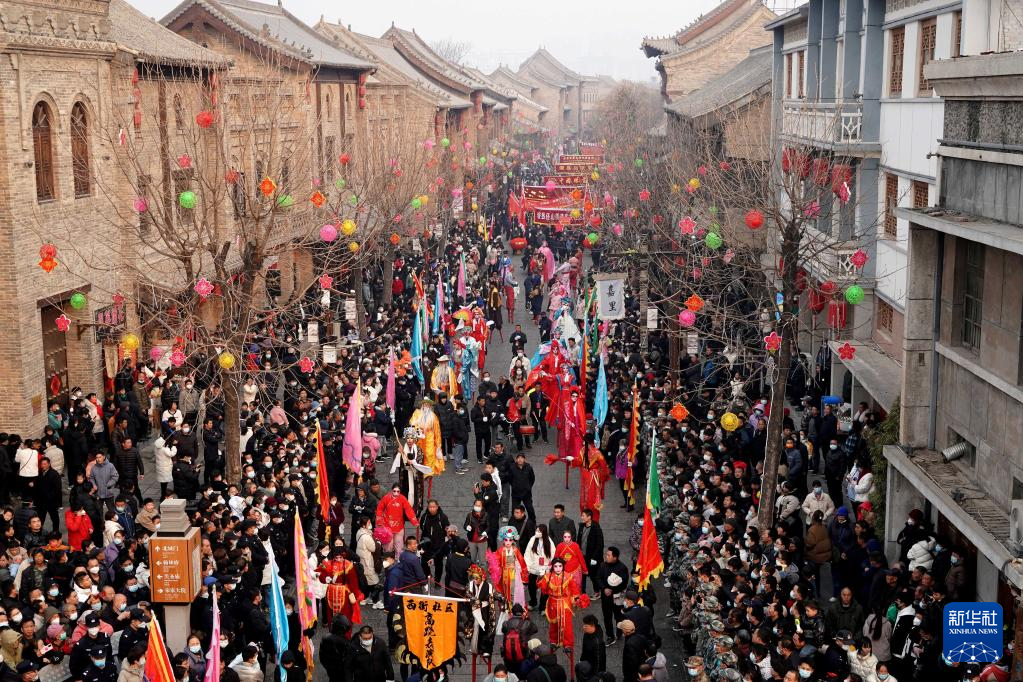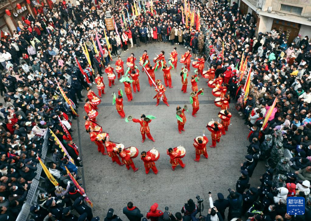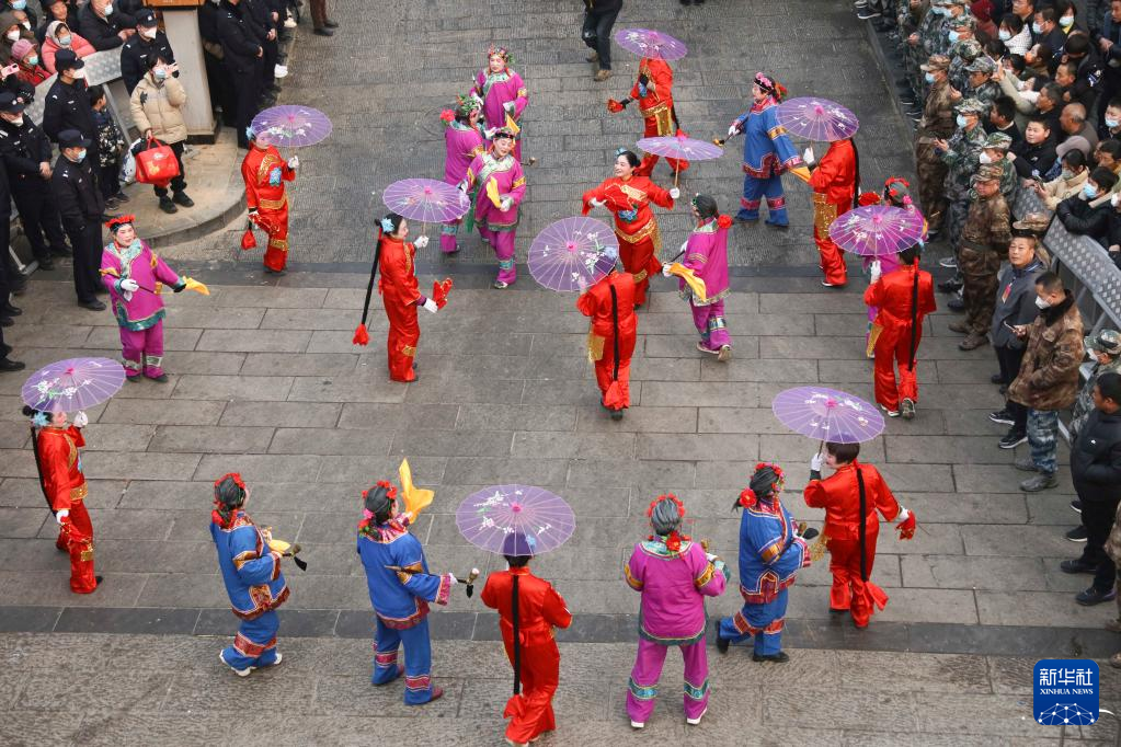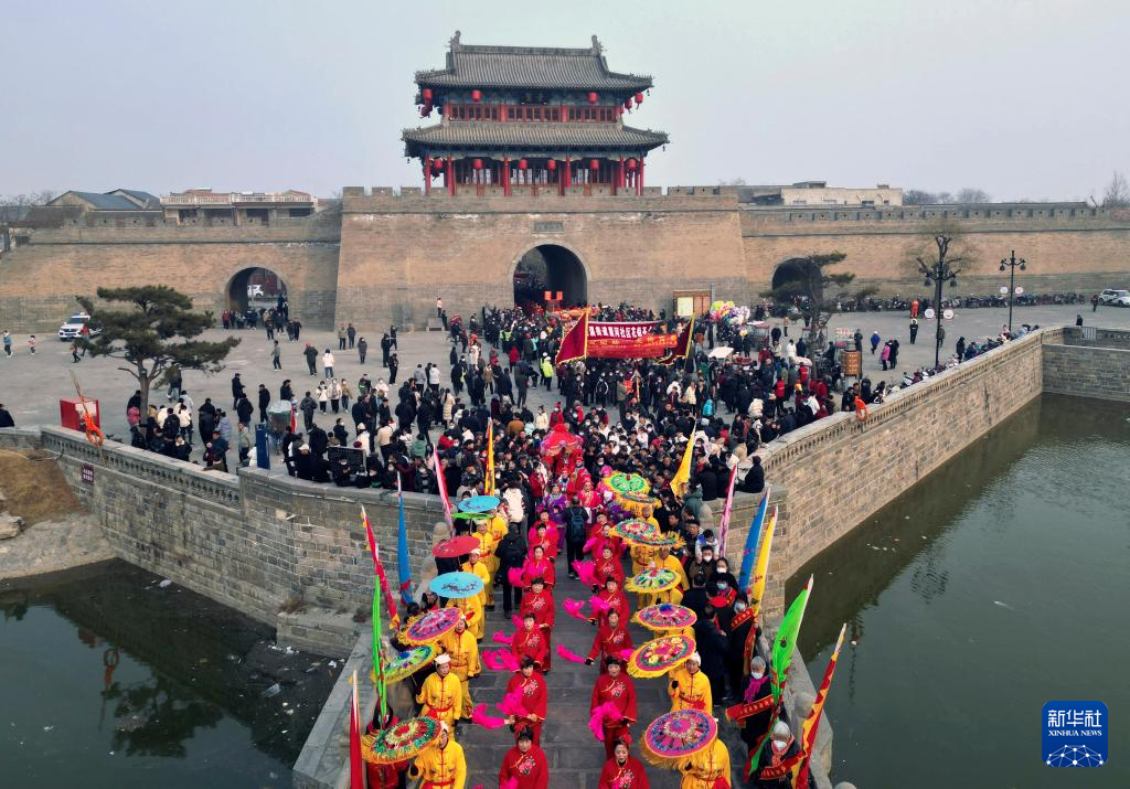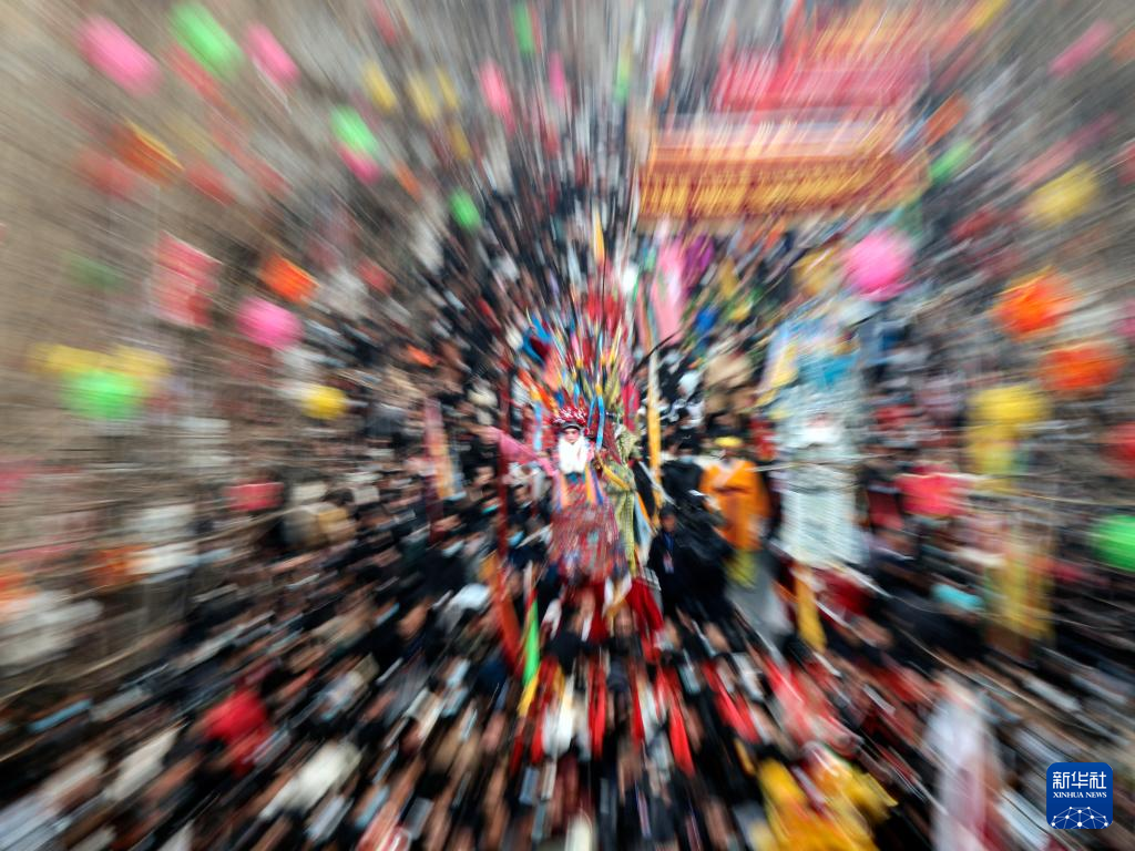 2月6日,社火团队的演员在庙会上表演(无人机照片)。