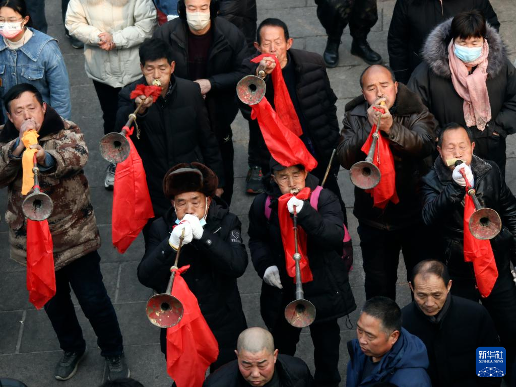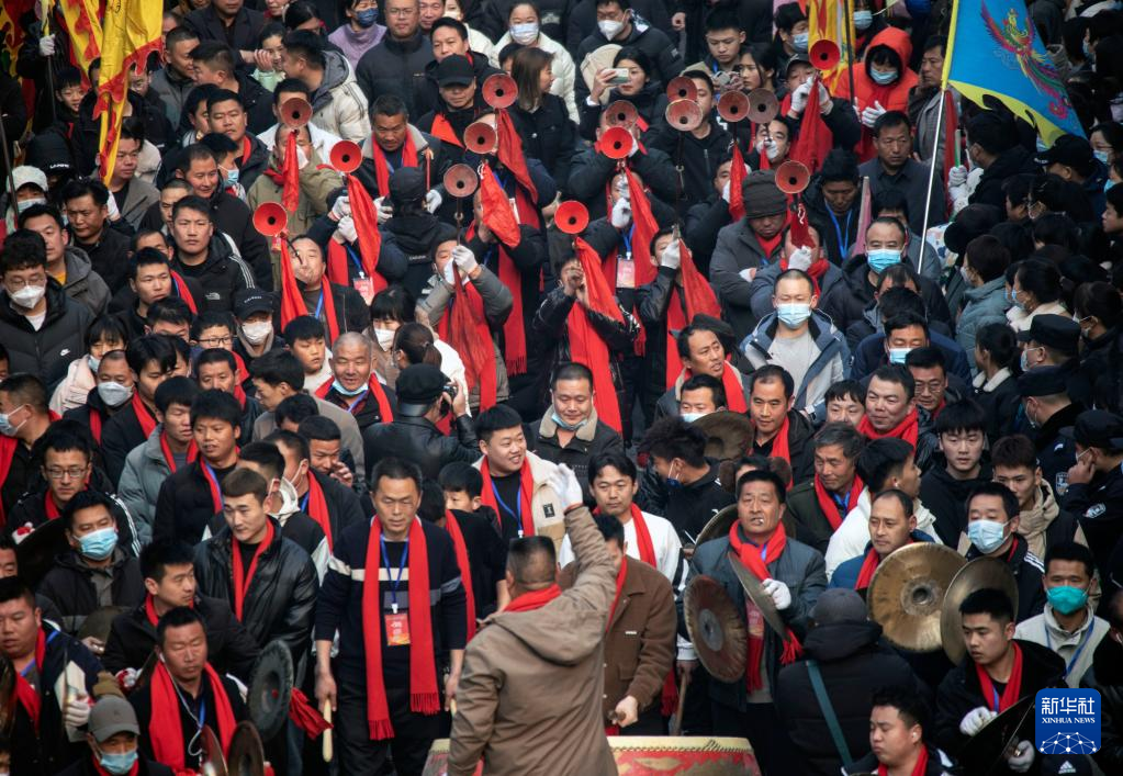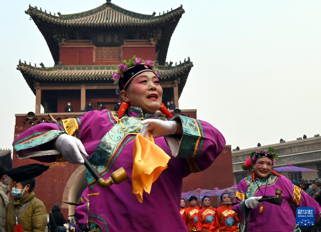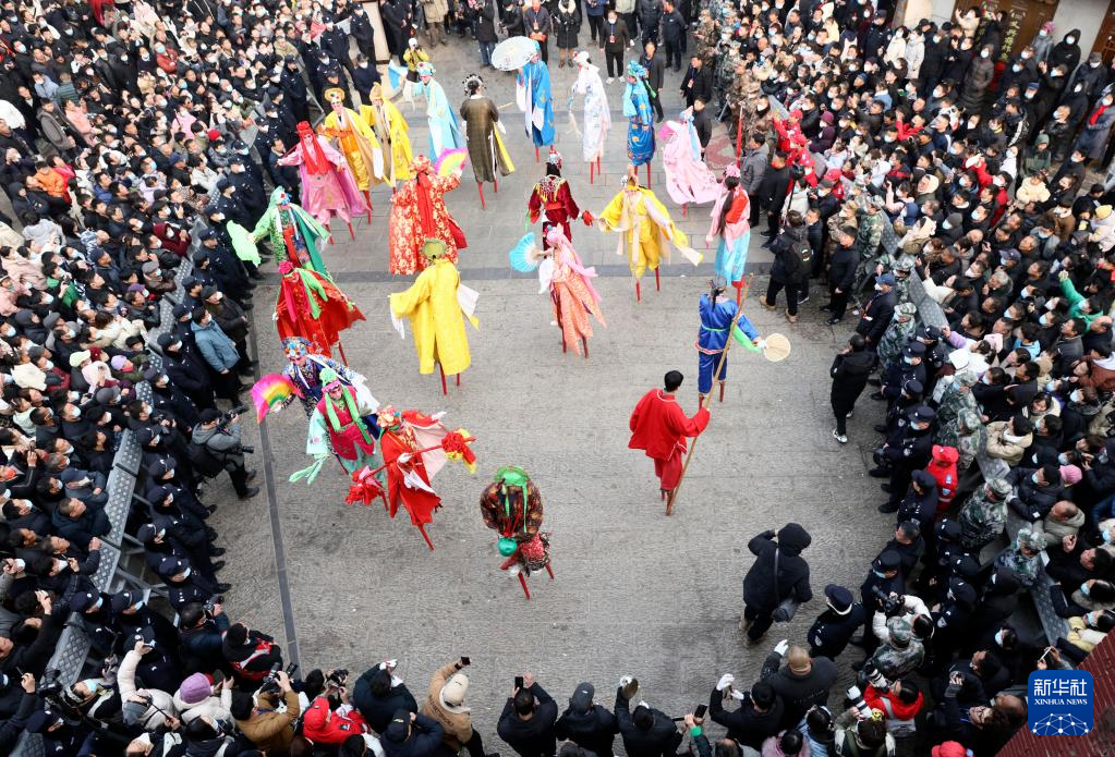 2月6日,社火团队的演员在庙会上表演(无人机照片)。