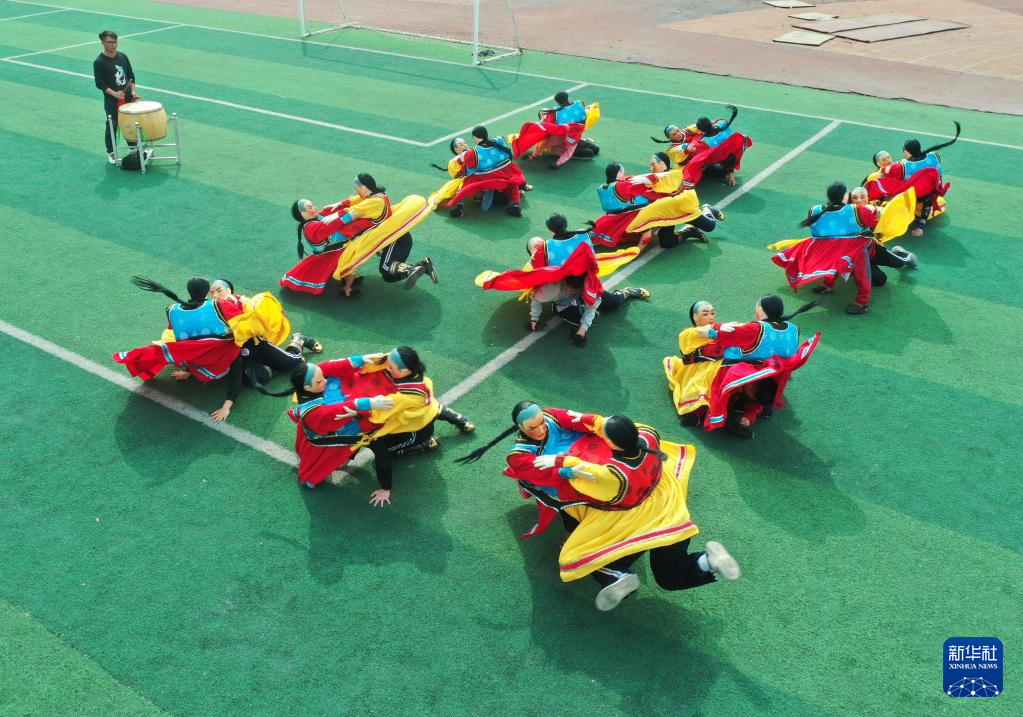 3月20日,隆化县职教中心学生在练习国家级非遗项目“二贵摔跤”(无人机照片)。