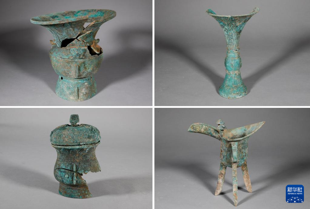河南安阳殷墟商王陵祭祀坑K23出土的青铜器(拼版资料照片)。