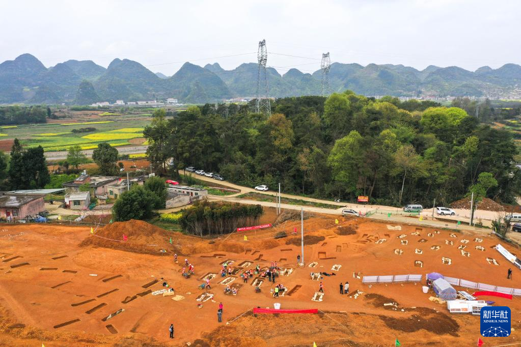 3月30日拍摄的贵州贵安新区大松山墓群挖掘现场(无人机照片)。