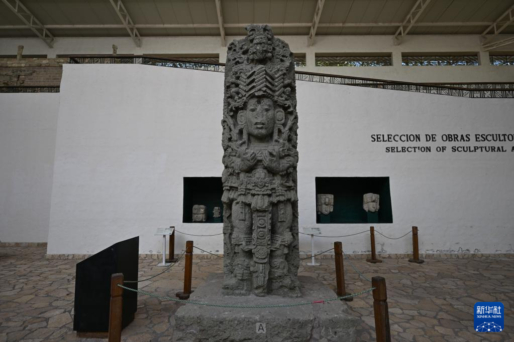 这是4月1日在洪都拉斯科潘玛雅古城遗址博物馆内拍摄的一处雕刻。