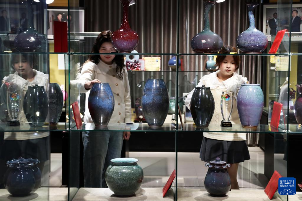 4月12日,游客在禹州市神垕古镇观赏展出的钧瓷作品。