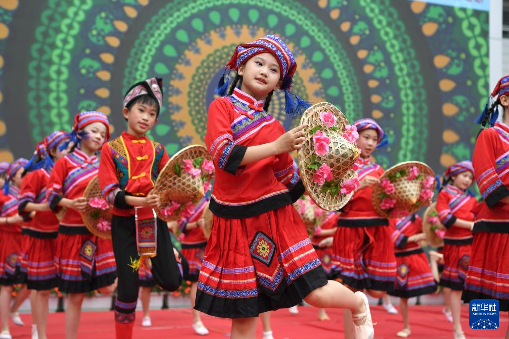 4月20日,孩子们在广西南宁市逸夫小学表演民族舞蹈。