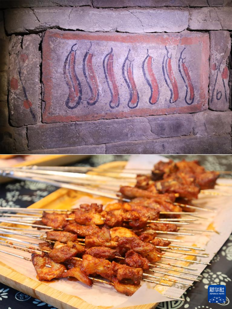 拼版照片:上图为嘉峪关魏晋墓六号墓的画像砖绘着悬挂着的羊肉(5月13日摄);下图为嘉峪关市一家烤肉店的烤肉(5月12日摄)。