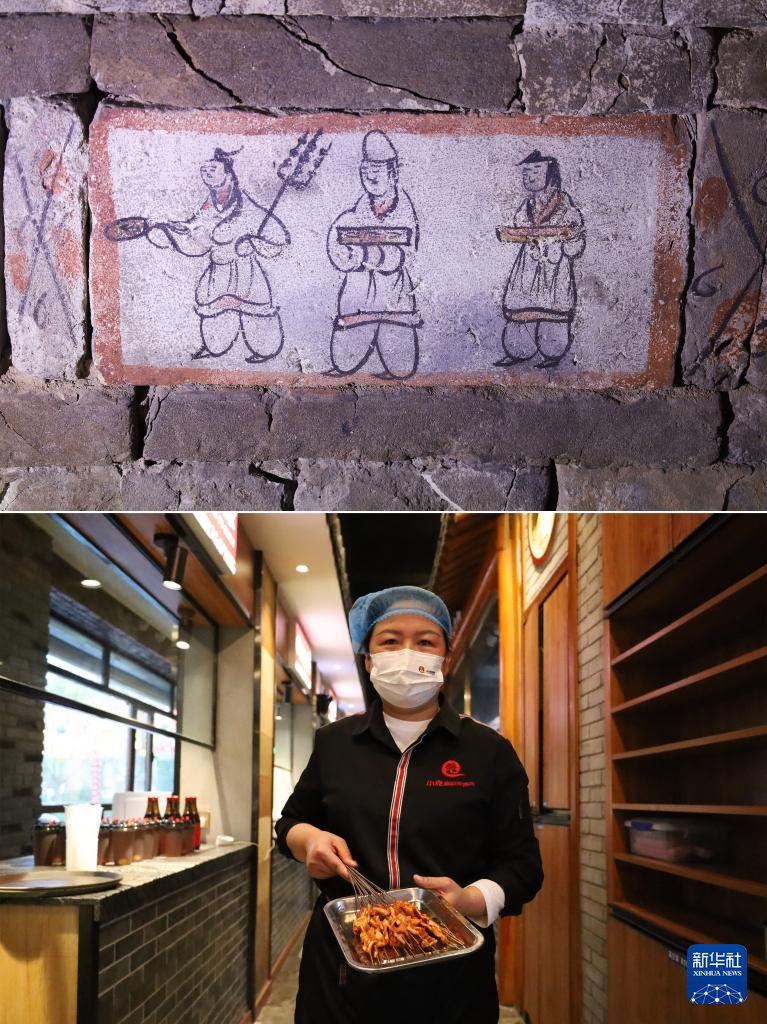 拼版照片:上图为嘉峪关魏晋墓六号墓的画像砖展现仆人将烤好的肉端上桌的场景(5月13日摄):下图为嘉峪关市一家烤肉店的服务员为顾客上菜(5月12日摄)。