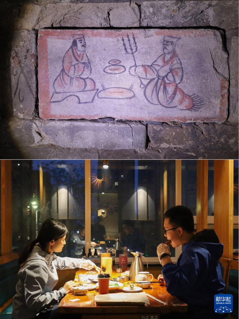 拼版照片:上图为嘉峪关魏晋墓六号墓的画像砖展现男主人宴请宾客的场景(5月13日摄);下图为游客在嘉峪关市的一家烤肉店吃烤肉(5月12日摄)。