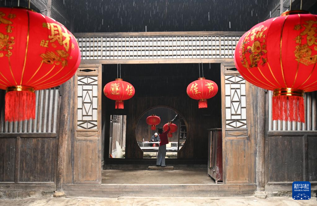 村民在湖南省常宁市中田村古民居内挂灯笼(3月3日摄)。