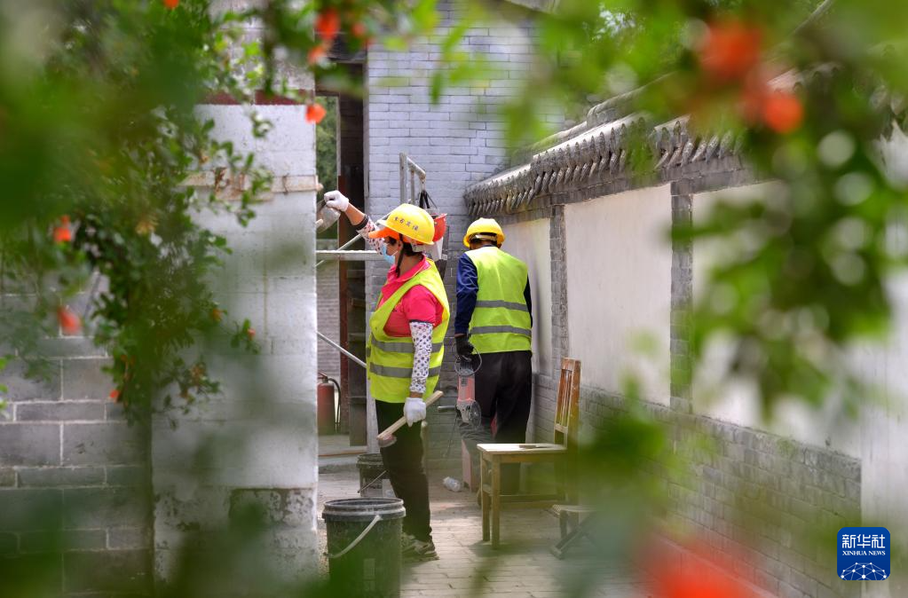 6月7日,施工人员在河北省石家庄市井陉县小梁江村进行民居修缮。