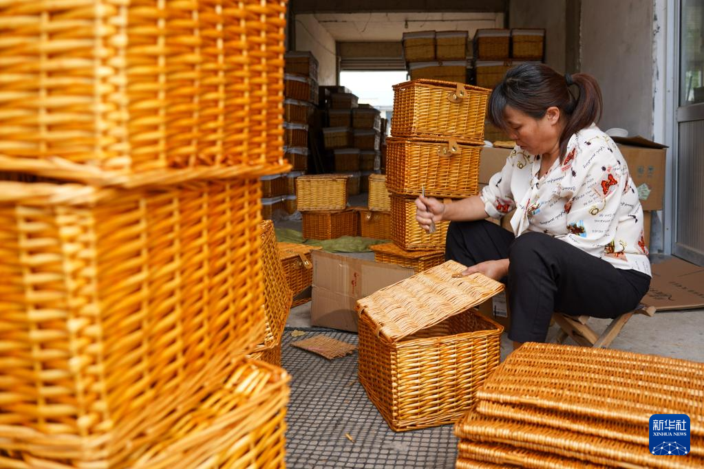 6月6日,临沭县青云镇西朱崔村居民在加工点生产柳编产品。