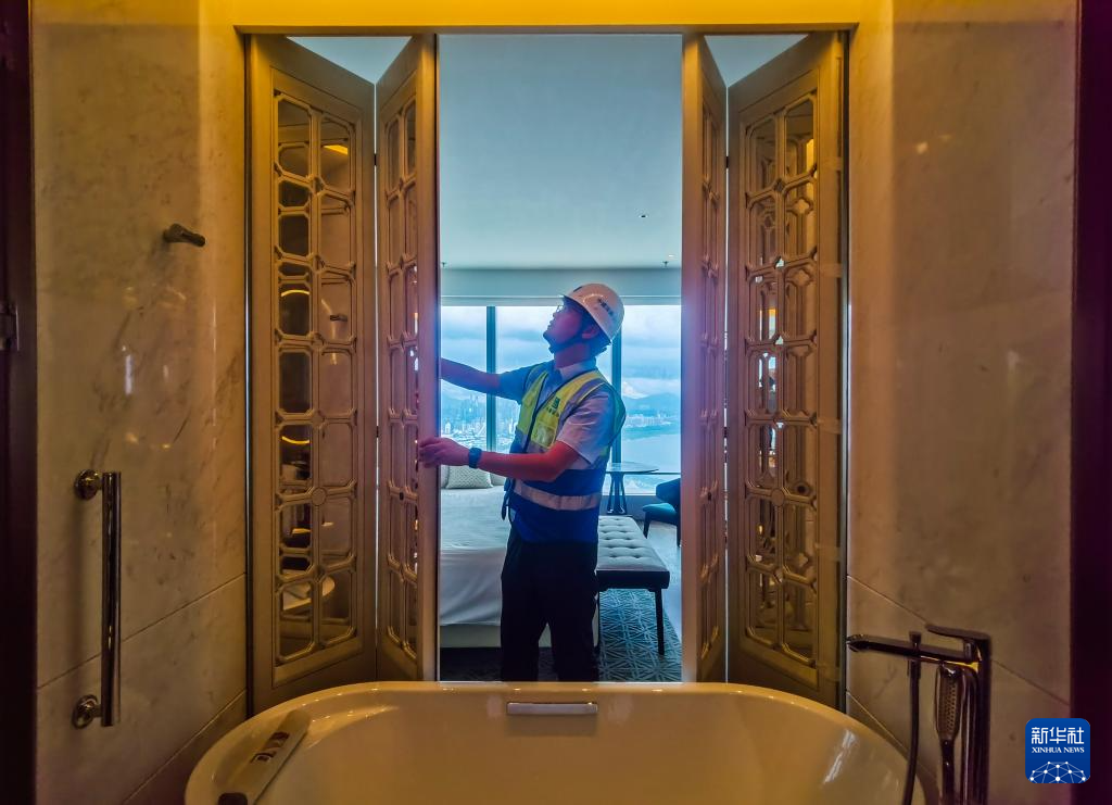 伍涛在客房检查满洲窗烛花玻璃折叠门的开合顺畅度(6月26日摄)。