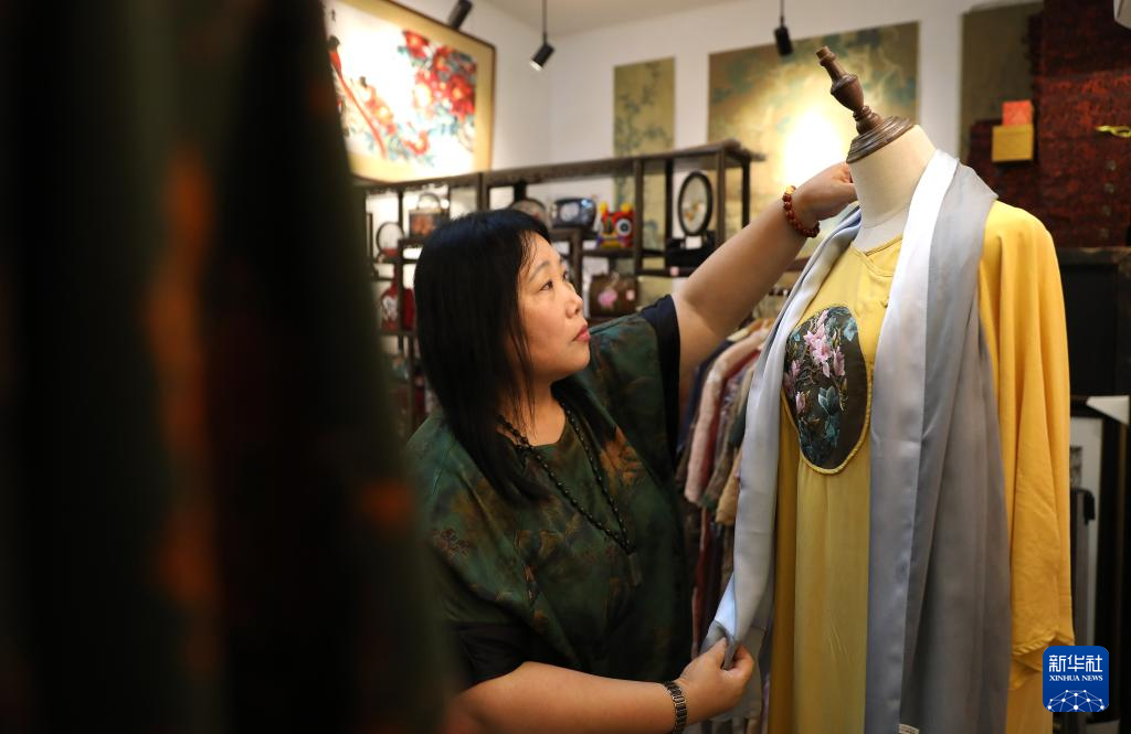 7月5日,王立君在位于辽宁省营口市辽河老街上的工作室里为她设计的带有满绣图案的民族服饰进行搭配。