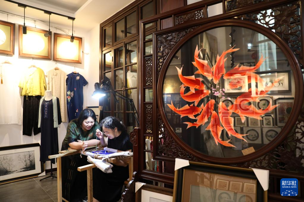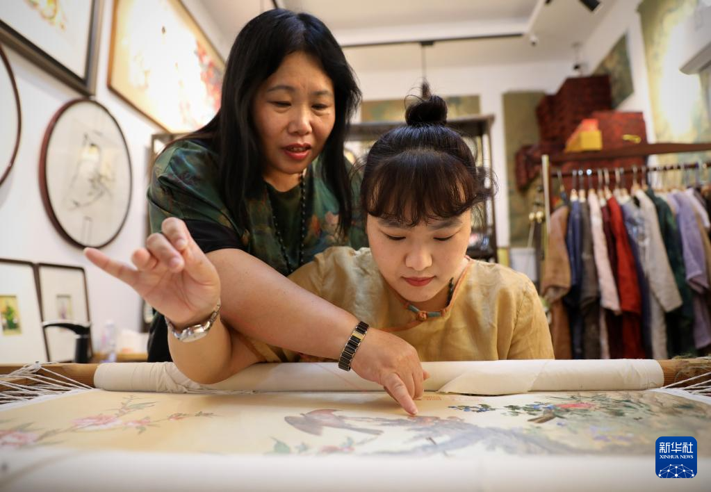 7月5日,王立君(左)在位于辽宁省营口市辽河老街上的工作室里给徒弟指导满绣创作技艺。