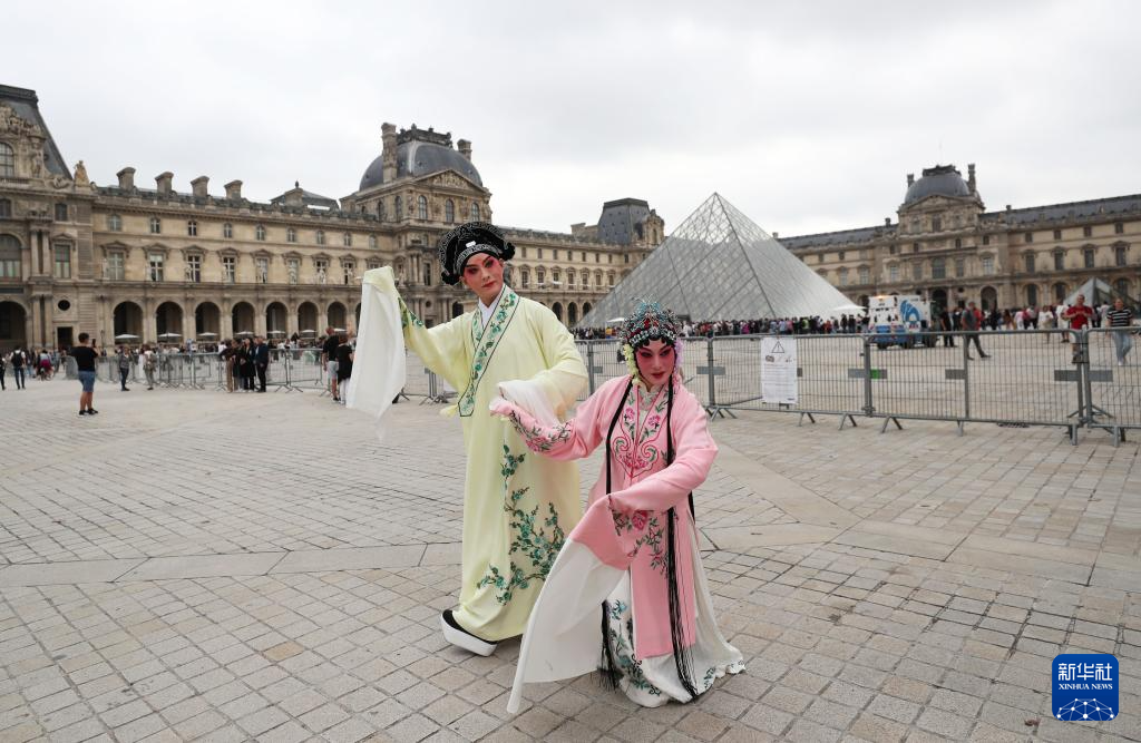 9月13日,江苏省演艺集团昆剧院院长施夏明(左)和江苏省演艺集团昆剧院国家一级演员孔爱萍在法国巴黎卢浮宫金字塔广场上参加昆曲快闪。
