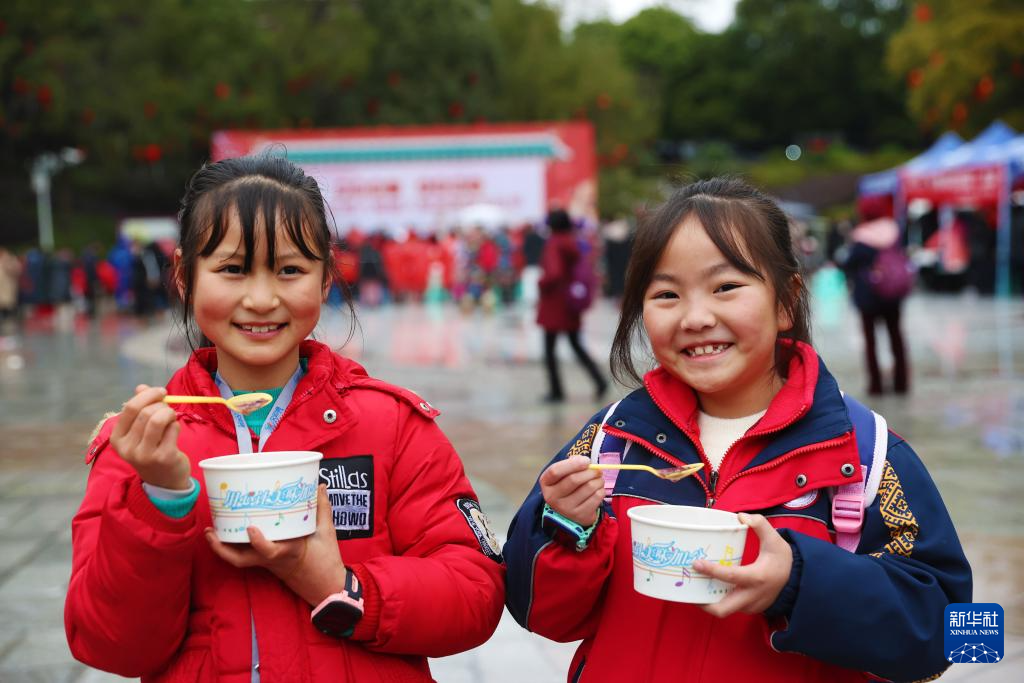 1月18日,在重庆市黔江区武陵文化广场,小朋友在品尝腊八粥。
