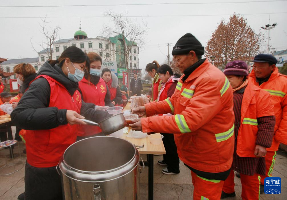 1月18日,在山东省临沂市平邑县地方镇街头,志愿者为环卫工人盛腊八粥。