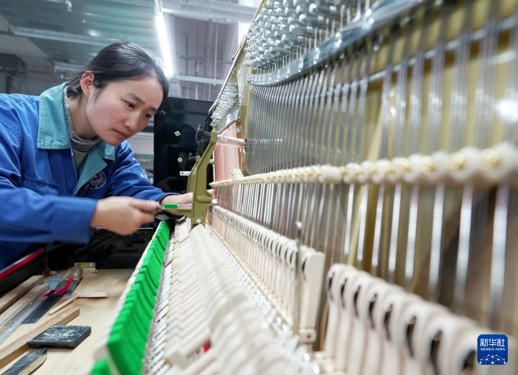1月19日,工人在河北省肃宁县一家钢琴企业的生产车间工作。